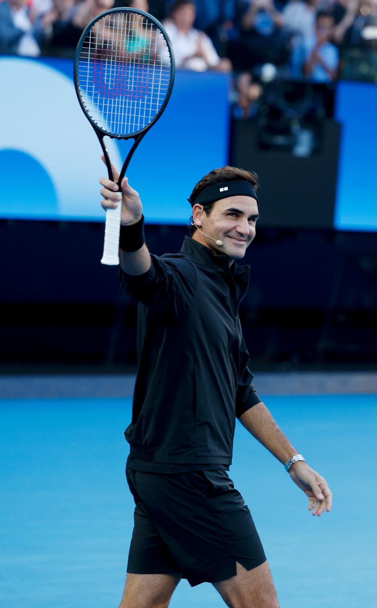 1月17日,费德勒在表演赛前向观众致意。新华社记者 马平 摄