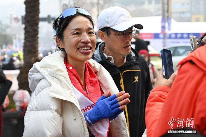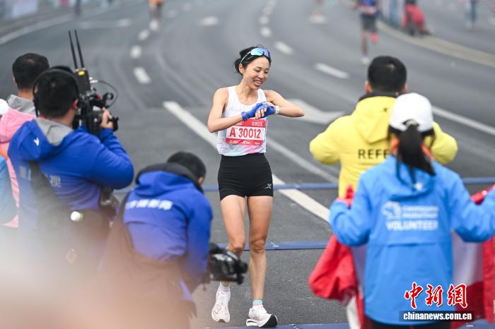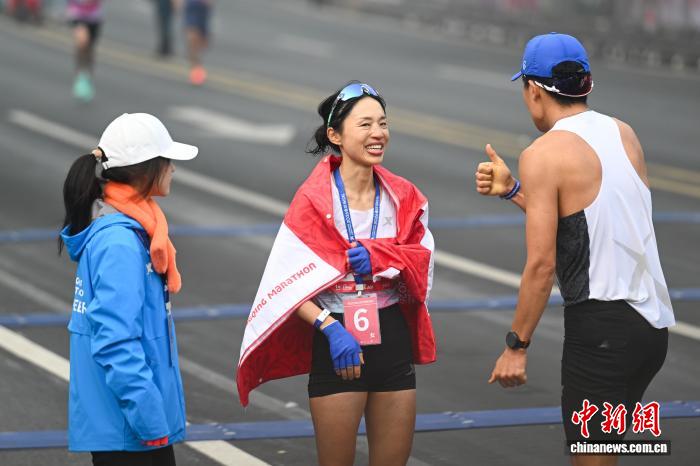 图为完赛后,一位马拉松选手向张水华“点赞”。 中新社记者何蓬磊摄