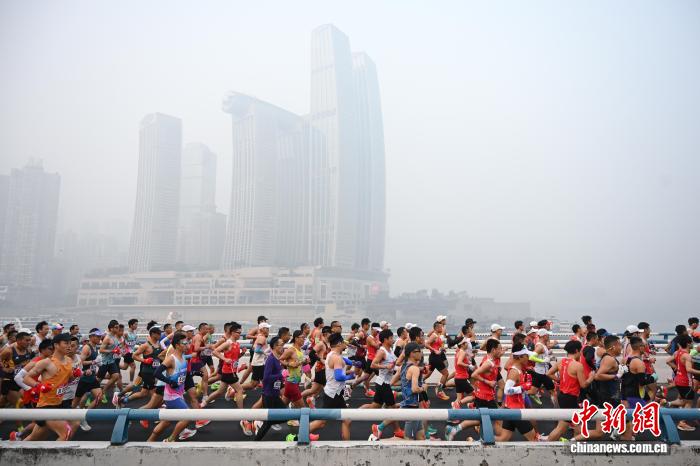 1月18日,2026长安汽车重庆马拉松举行。图为跑友在长江之滨比拼速度与激情。 中新社记者 何蓬磊摄