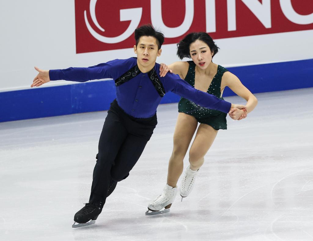 2020年2月8日,隋文静/韩聪(左)在韩国首尔举行的四大洲花样滑冰锦标赛双人滑比赛中