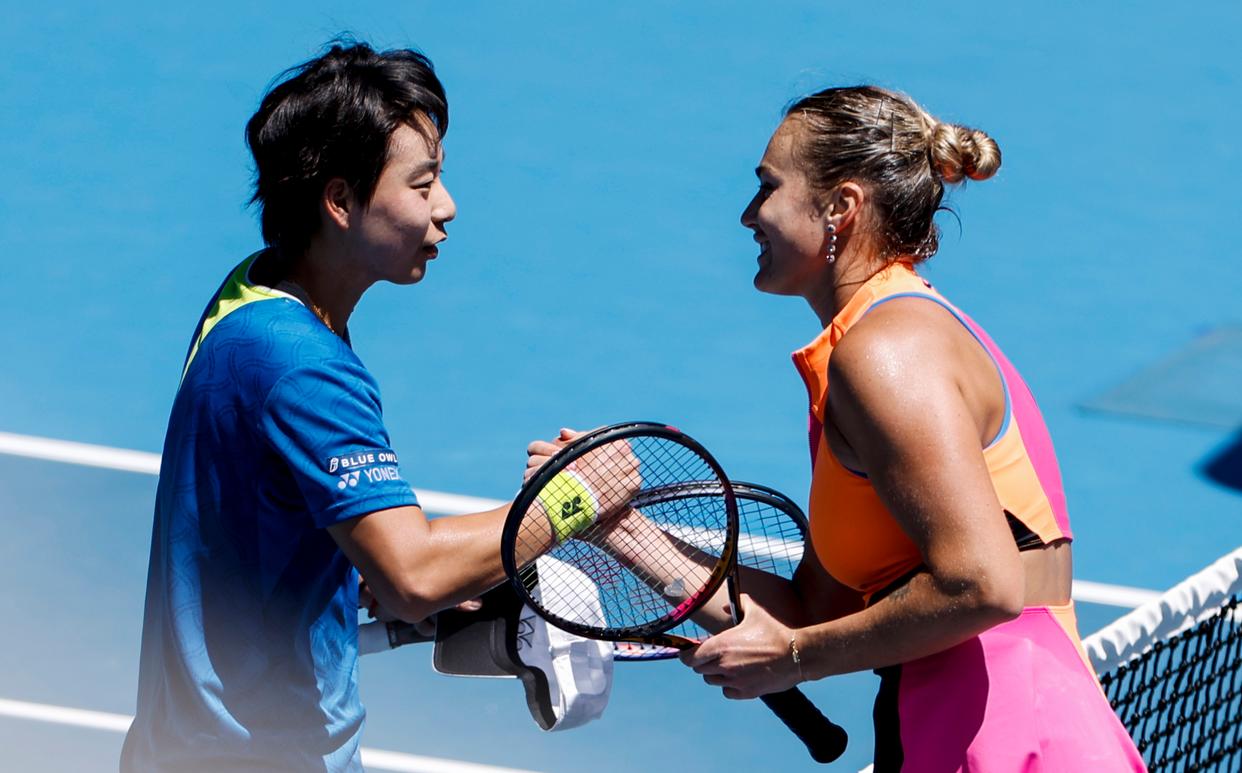 1月21日,中国选手白卓璇(左)与白俄罗斯选手萨巴伦卡赛后握手致意。新华社记者 马平 摄