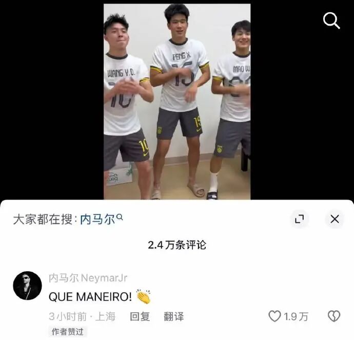 赛后,王钰栋、彭啸、毛伟杰在社交媒体上晒出三人合拍翻跳内马尔“胜利之舞”的视频,并配文:“计划有变,决赛见!(有点僵硬)”稍后,内马尔现身评论区评论:“QUE MANEIRO!(真棒!)”