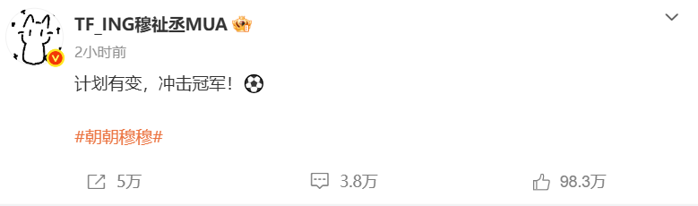 TF家族成员穆祉丞也发文支持:计划有变,冲击冠军!据悉,穆祉丞十分热爱足球,还曾因对足球的热情和天赋被导演看中,出演电影《初次尝到寂寞》。