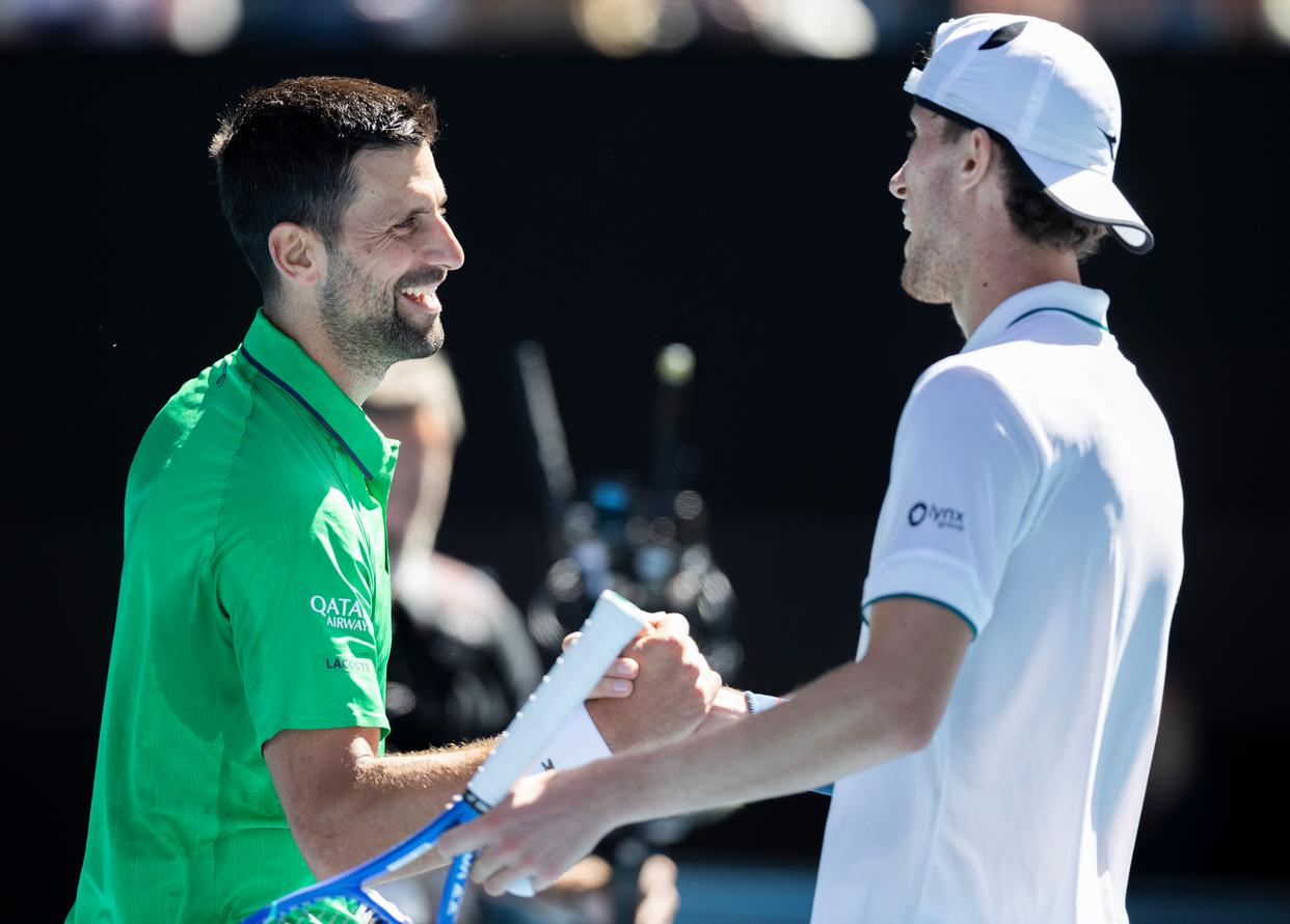 1月22日,焦科维奇(左)与马埃斯特雷利赛后握手致意。新华社发(胡泾辰摄)