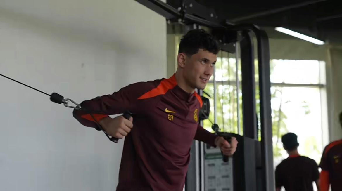 U23国足队员拜合拉木在集训中进行力量训练。(视频截图) 无论身在何处,他总会辟出一间“工作室”,里面堆满比赛录像。他坚持为每位队员制作专属战术视频。在他看来,这种“量身定制”远比泛泛的全队讲解更为有效。“对于中国球员来说,这种方式更容易理解。”