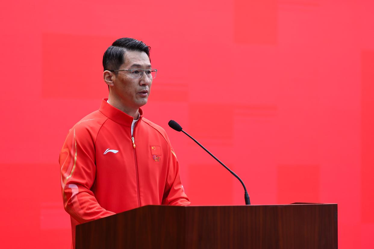 1月27日,教练员代表、自由式滑雪空中技巧队主教练纪冬在大会上发言。新华社记者 那宇奇 摄