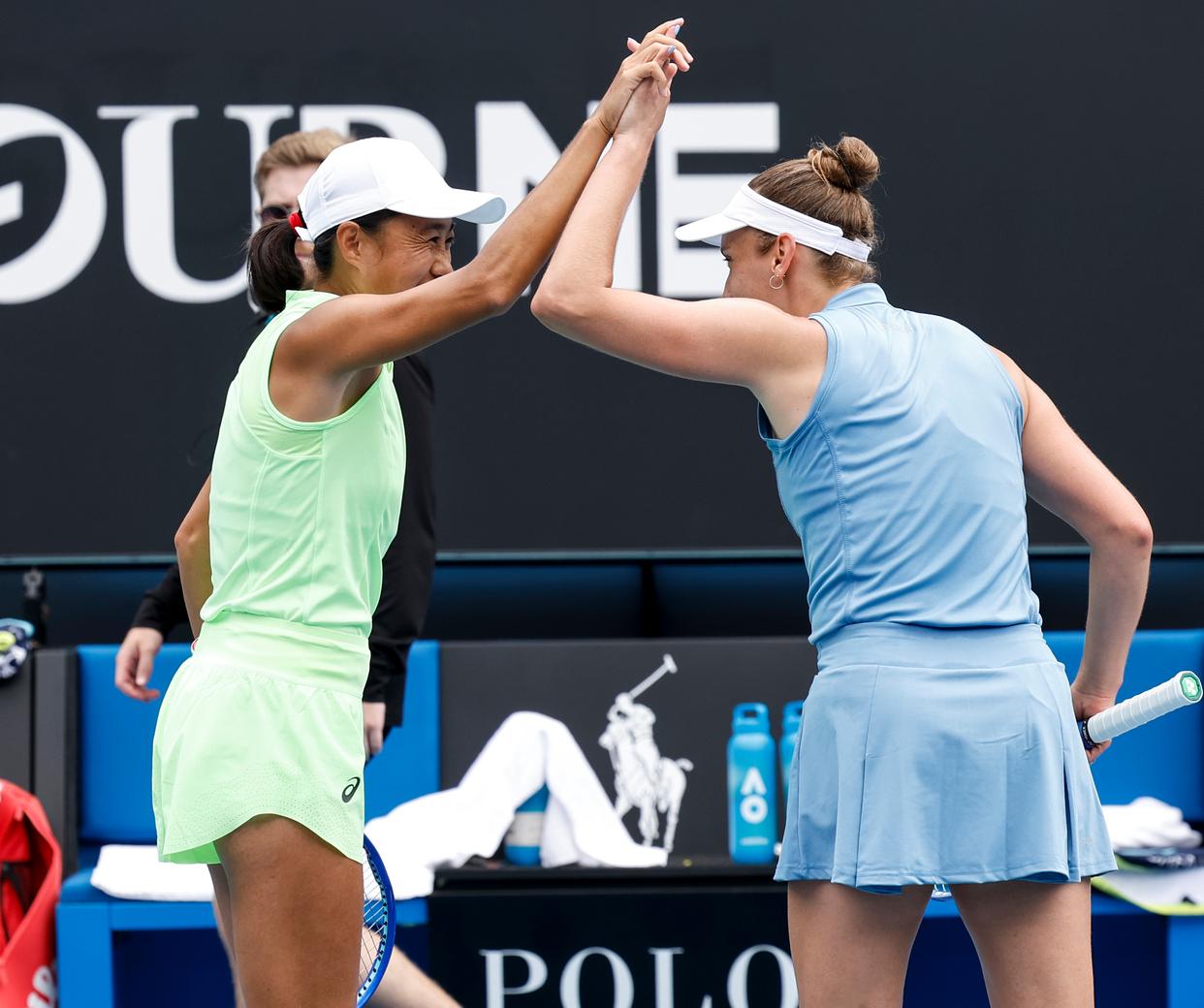 1月28日,张帅(左)/梅尔滕斯庆祝胜利。新华社记者 马平 摄