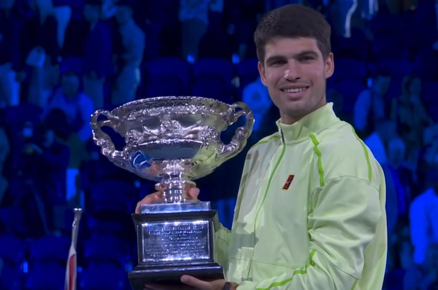 至此,22岁的阿尔卡拉斯捧得澳网冠军奖杯,集齐了四大满贯的冠军。