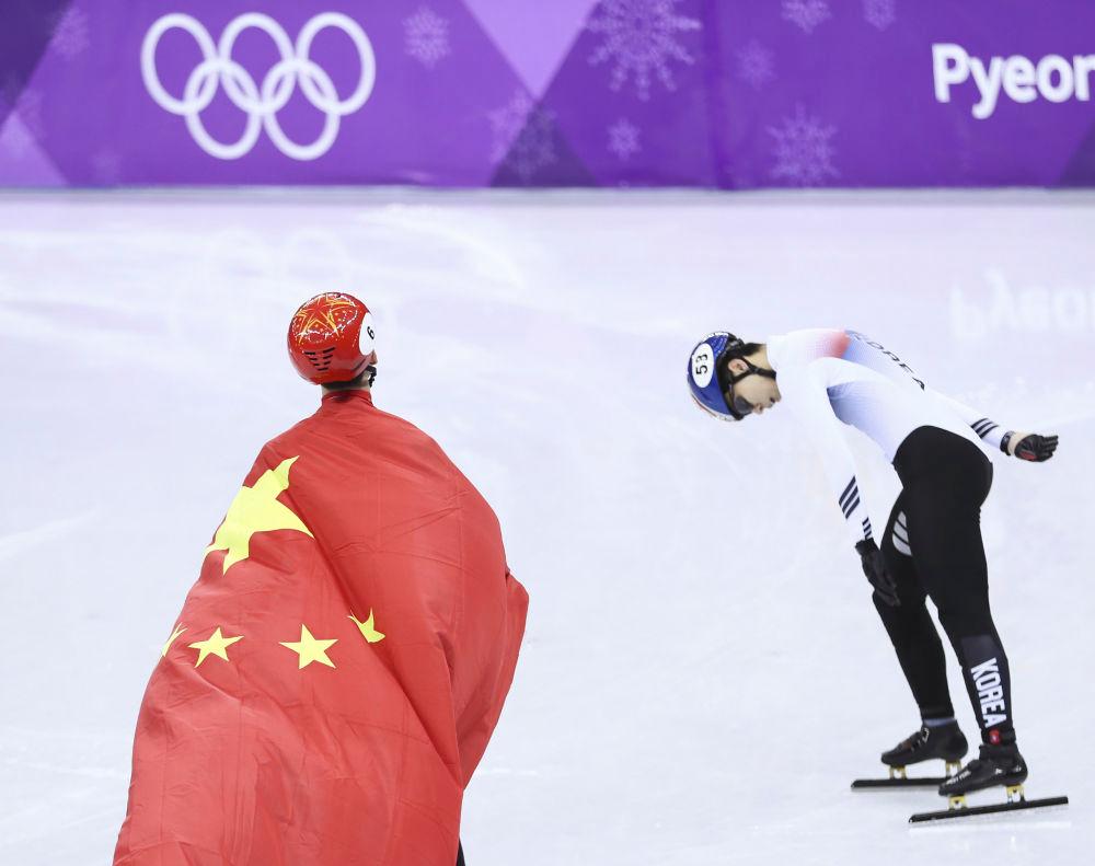 ↑2018年2月22日,在平昌冬奥会短道速滑男子500米决赛后,中国选手武大靖(左)身披国旗庆祝夺冠。