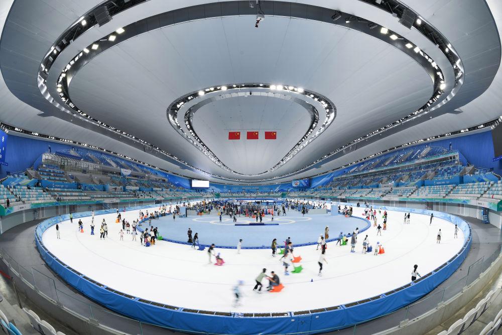 ↑2022年10月2日,小朋友们在国家速滑馆体验滑冰。