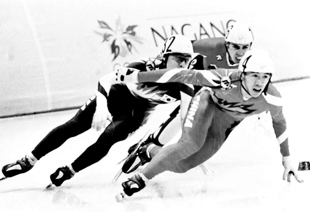 ↑1998年2月17日,李佳军(前)在长野冬奥会短道速滑男子1000米比赛中。