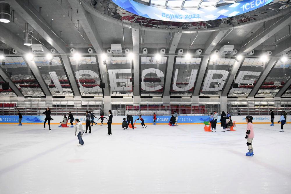↑2023年1月23日,游客在“冰立方”冰上运动中心滑冰。