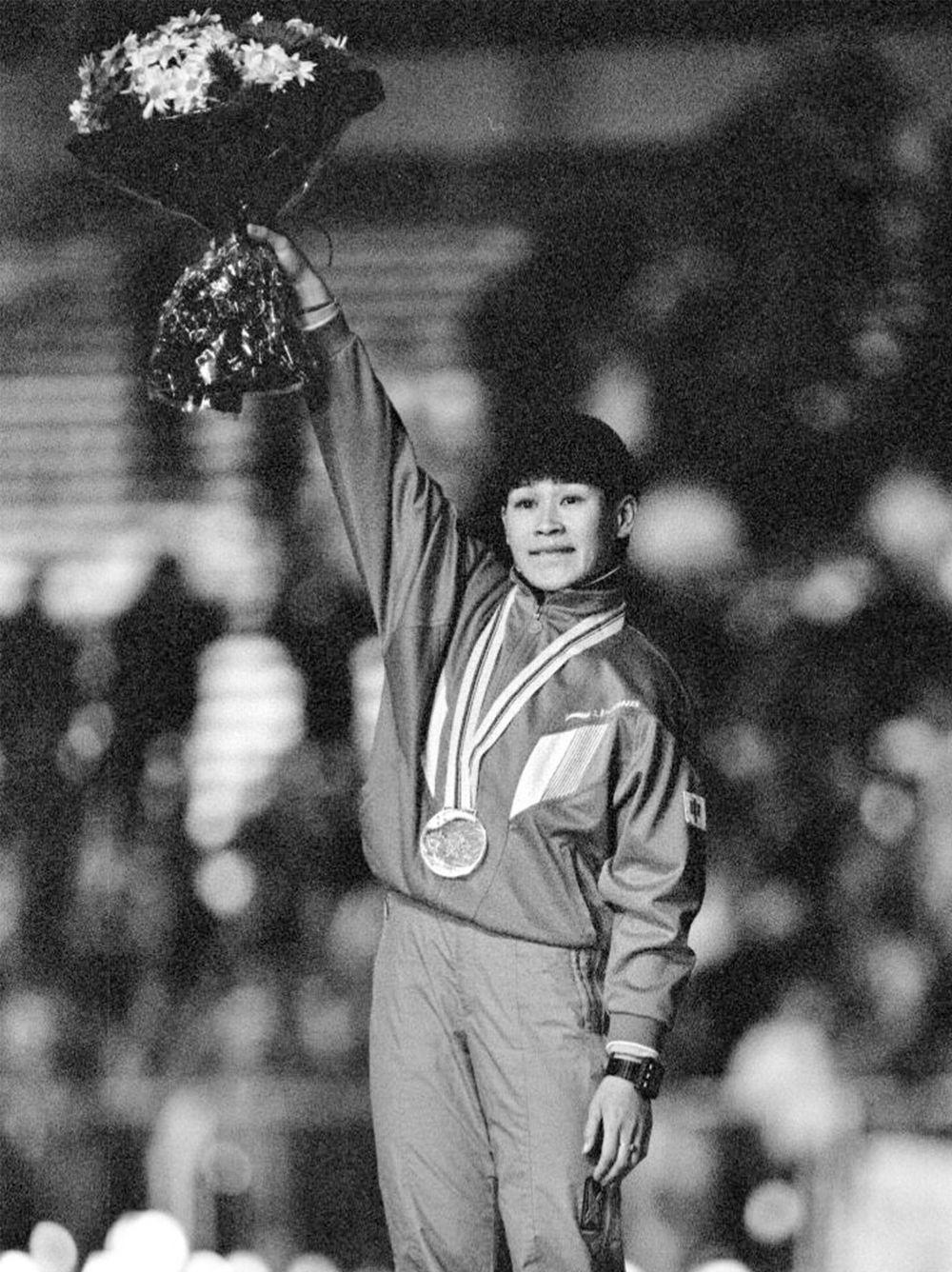 ↑1992年2月22日,李琰在阿尔贝维尔冬奥会短跑道速滑女子500米决赛中夺得银牌。