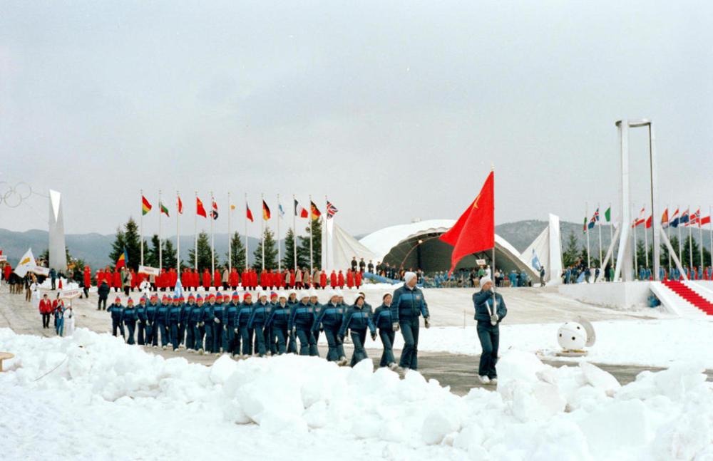 ↑1980年2月13日,中国代表团在普莱西德湖冬奥会开幕式上入场。