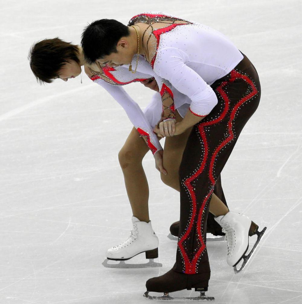 ↑2006年2月13日,张丹在都灵冬奥会花样滑冰双人滑自由滑比赛中不幸倒地受伤,但她与张昊坚持完成了比赛,并以189.73分的总成绩夺得银牌。这是张昊搀扶着受伤的张丹。