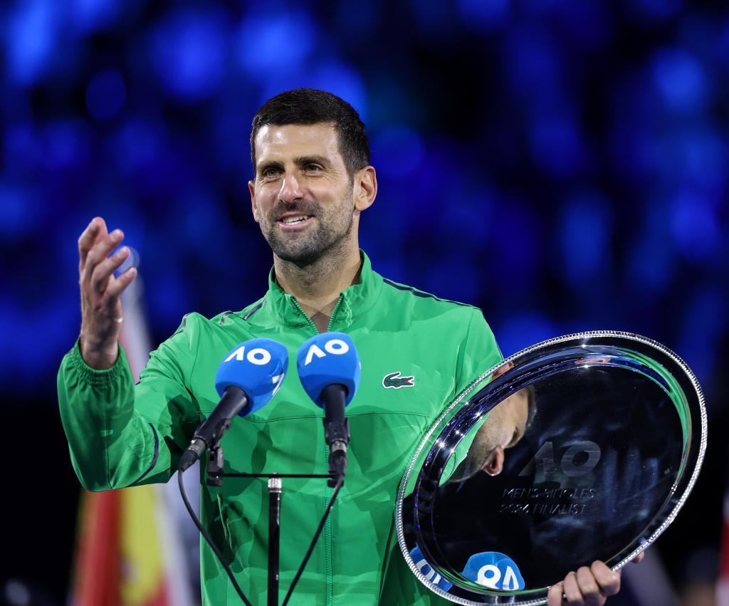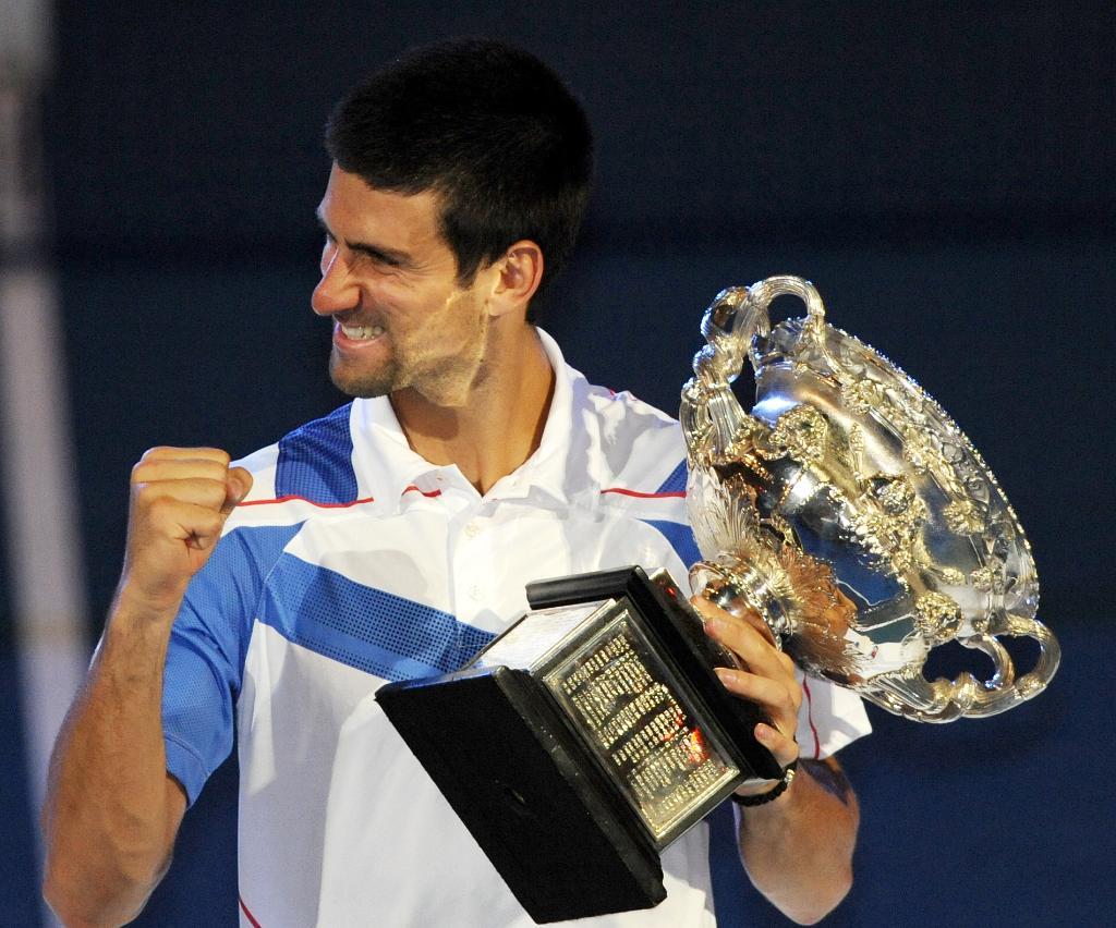 2011年1月30日,塞尔维亚选手焦科维奇在2011年澳大利亚网球公开赛男子单打决赛的颁奖仪式上。新华社记者陈铎摄