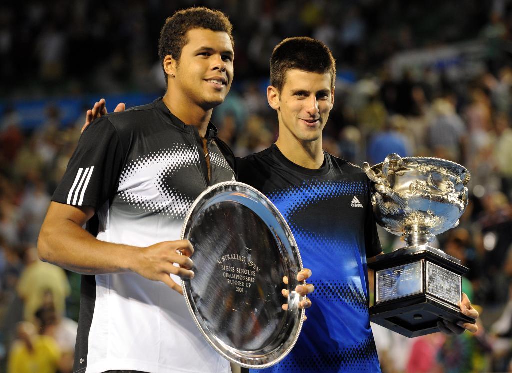 2008年1月27日,塞尔维亚选手焦科维奇(右)在2008年澳大利亚网球公开赛男单决赛中3比1战胜法国选手特松加,夺得冠军。 新华社记者吕小炜摄