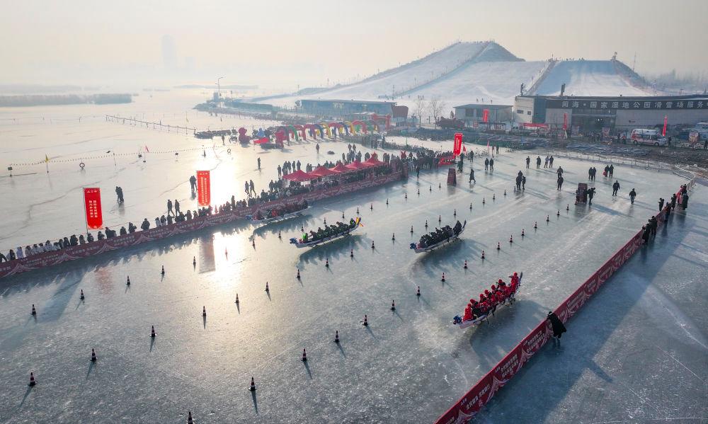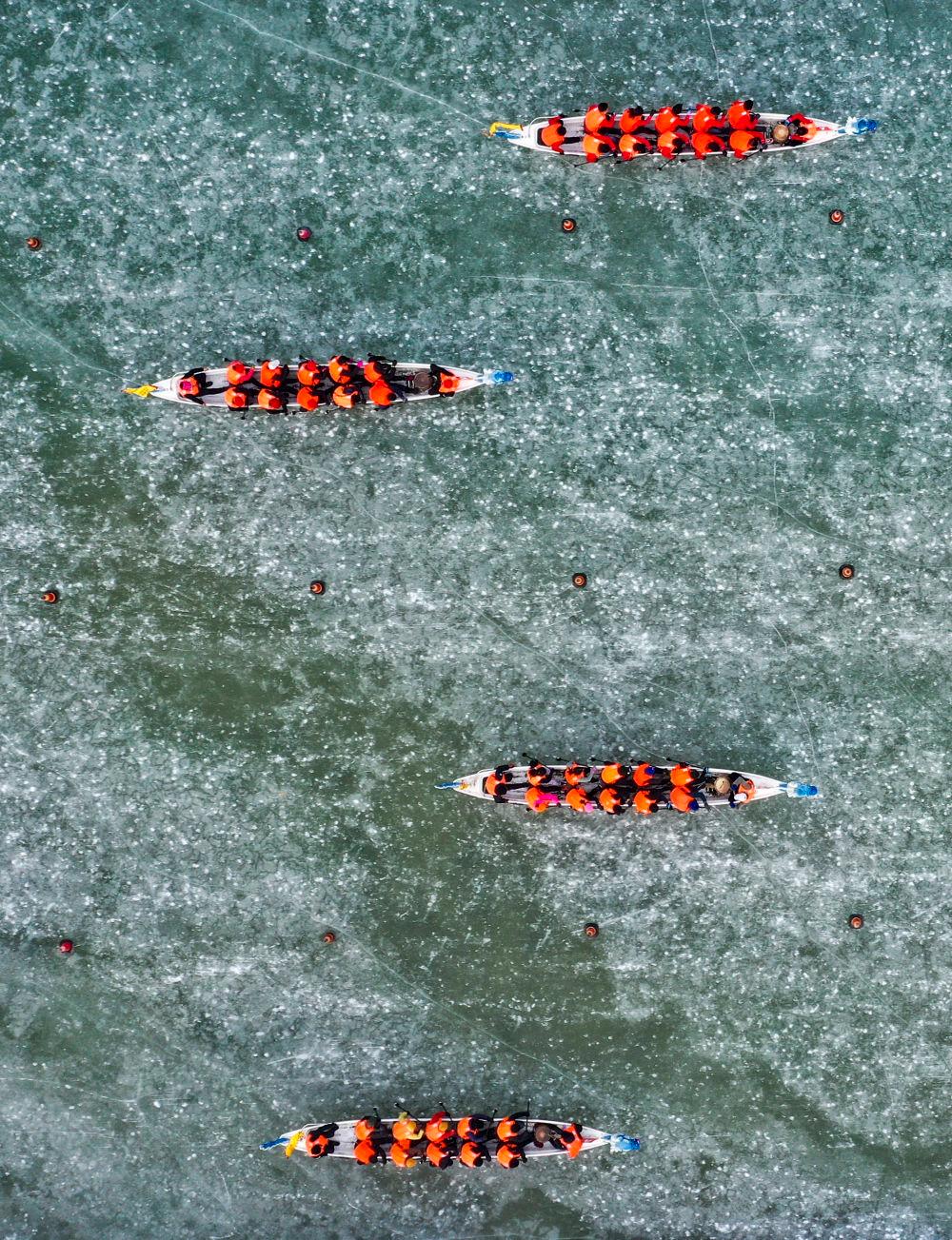 2022年1月8日,市民在宁夏银川阅海湖面上参加冰上龙舟比赛(无人机照片)。新华社记者冯开华摄