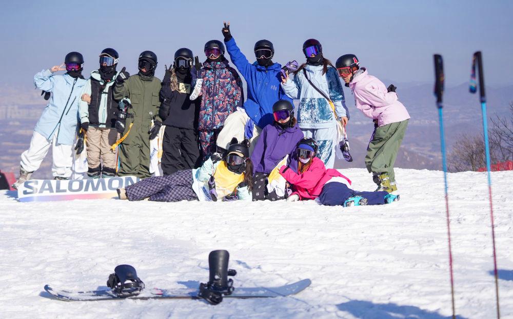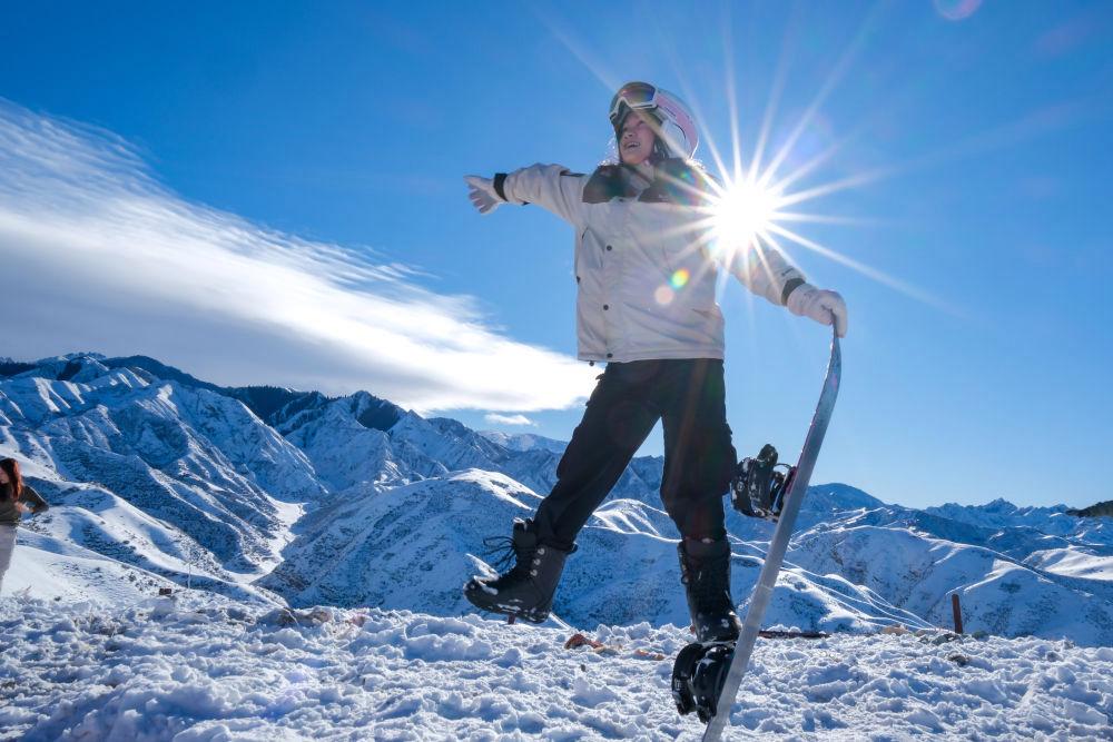 2023年12月22日,游客在新疆阜康市天山天池国际滑雪场摆造型拍照。新华社记者张铖摄
