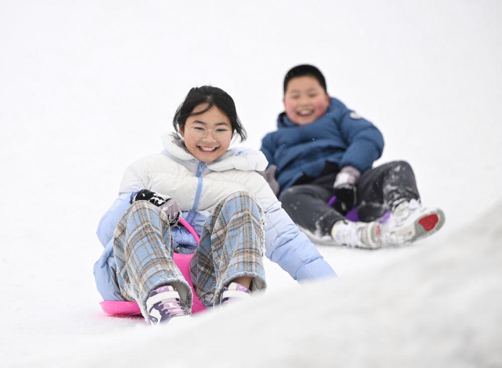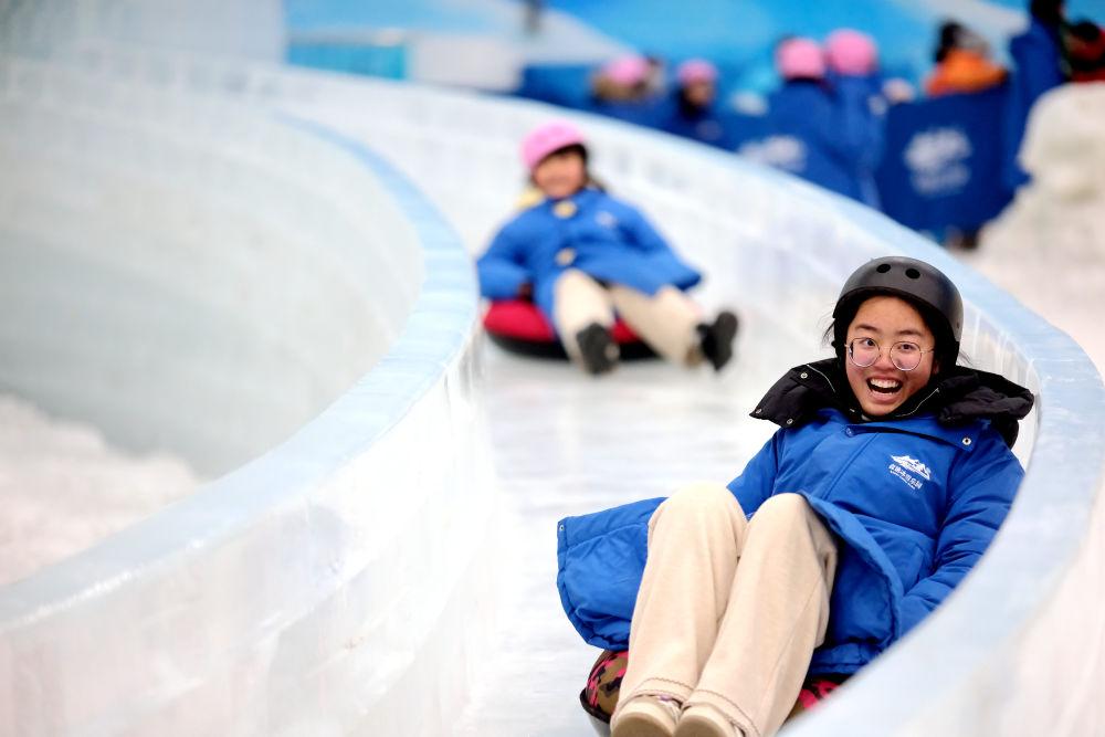 2026年1月14日,广西“小砂糖橘”在位于吉林长春的长春冰雪新天地玩冰滑梯。