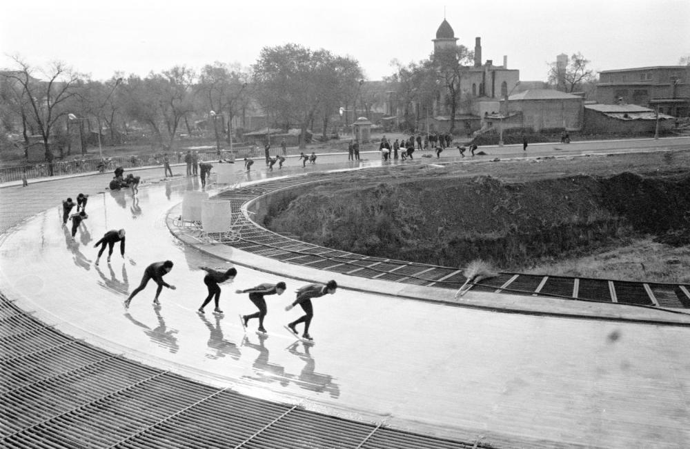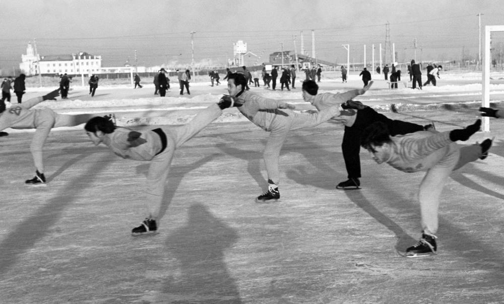 1954年,东北农学院、东北林学院的学生在哈尔滨市练习滑冰。新华社记者胡伟摄
