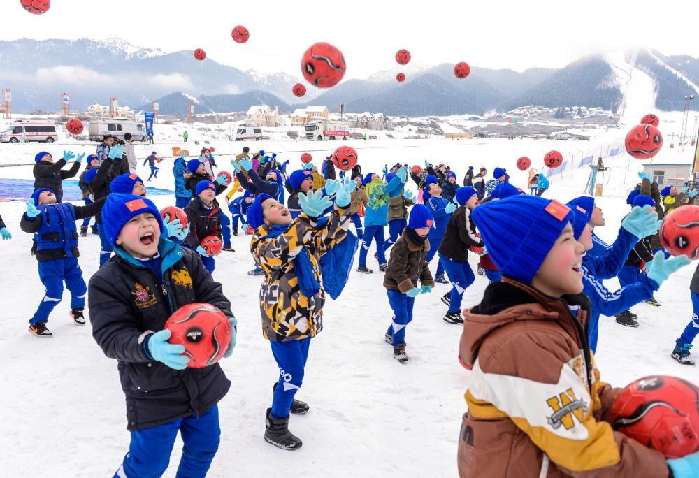 2016年1月30日,乌鲁木齐市第五小学足球队队员们在第十三届全国冬季运动会闭幕式前进行雪地足球表演项目的最后排练。新华社记者王菲摄