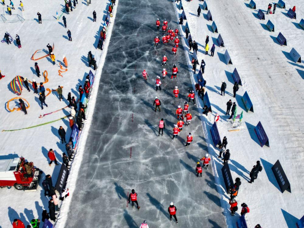 2024年1月30日,在吉林省白山市靖宇县举行的首届中国·吉林松花江滑冰马拉松挑战赛暨2024年全国全民健身大拜年主会场活动中,参赛者在滑冰马拉松挑战赛中(无人机照片)。新华社记者颜麟蕴摄