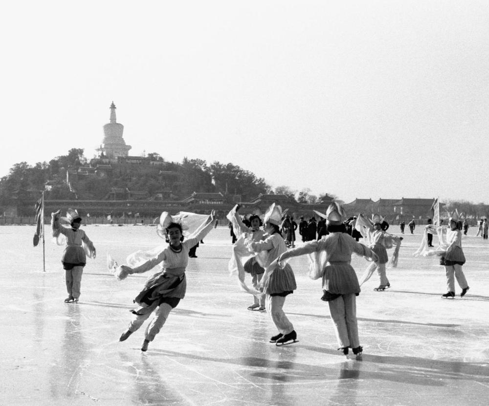1980年1月13日,在北京北海公园举行具有我国民族特色的化装滑冰表演。图为九名少女表演的荷花舞。新华社记者宋连峰摄