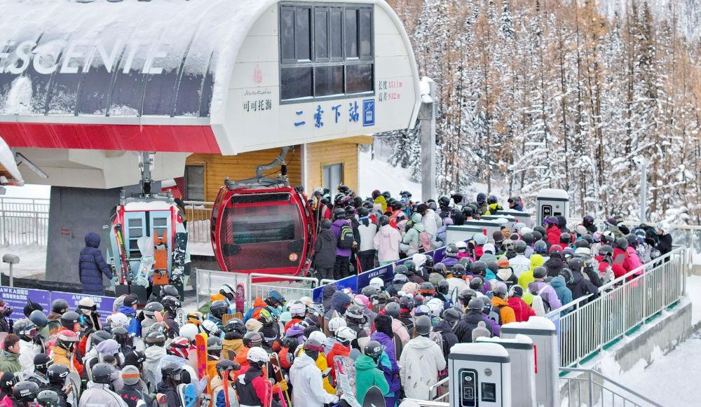 这是游客在新疆阿勒泰可可托海国际滑雪度假区排队等候乘坐缆车(无人机照片,2024年11月15日摄)。新华社记者胡虎虎摄