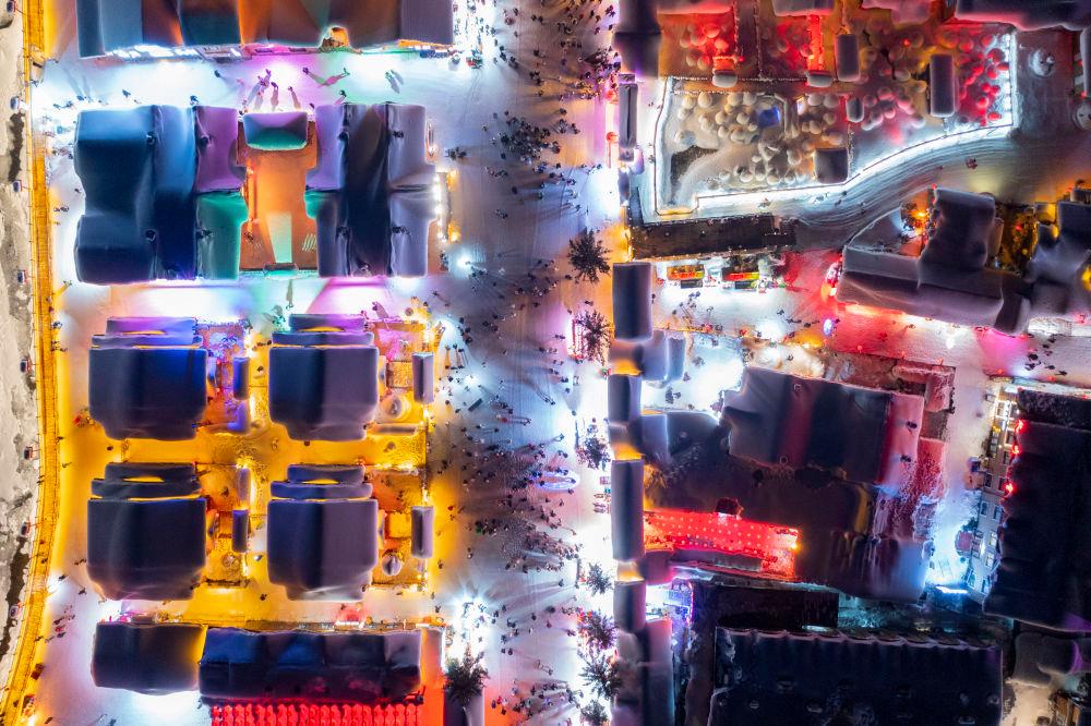 2025年1月23日,游客在黑龙江哈尔滨冰雪大世界园区内游览(无人机照片)。新华社记者 张涛 摄