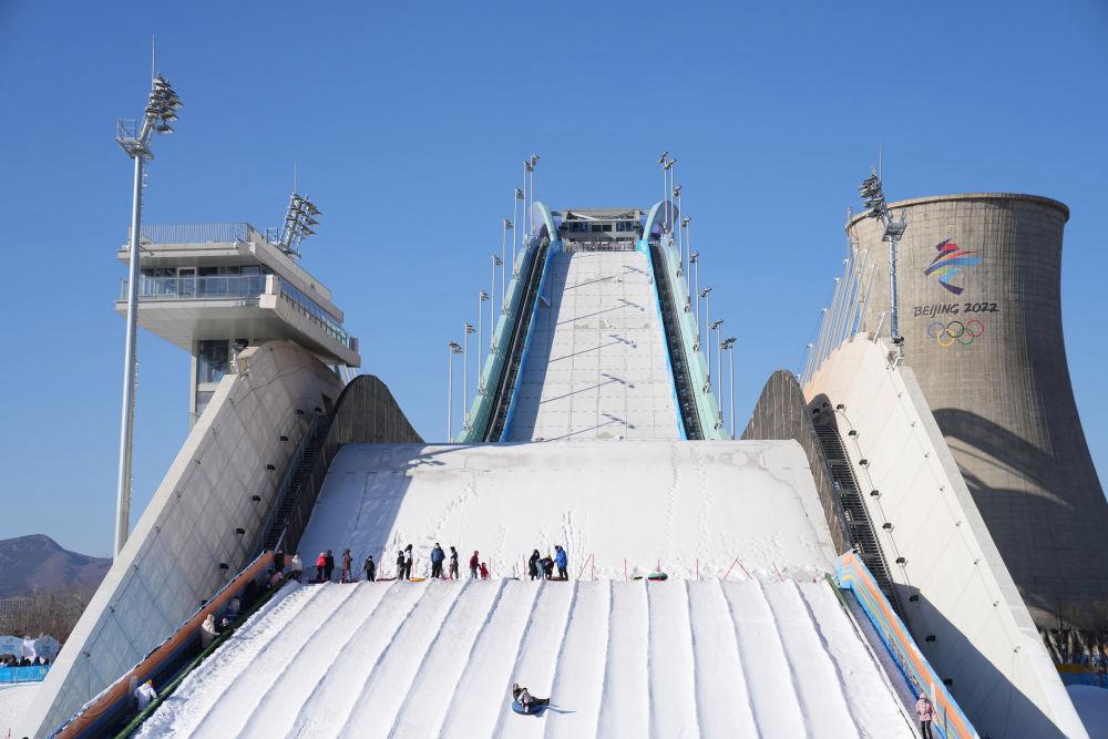 2023年1月31日,游客在首钢滑雪大跳台下的“首钢园冰雪汇”体验雪上游乐项目。新华社记者 鞠焕宗 摄