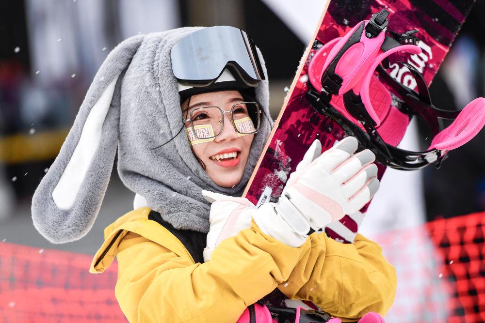 2022年11月19日,在第28届吉林国际雾凇冰雪节暨新雪季开板启动仪式上,滑雪爱好者在万科松花湖度假区滑雪场抱着滑雪板拍照留念。新华社记者 许畅 摄