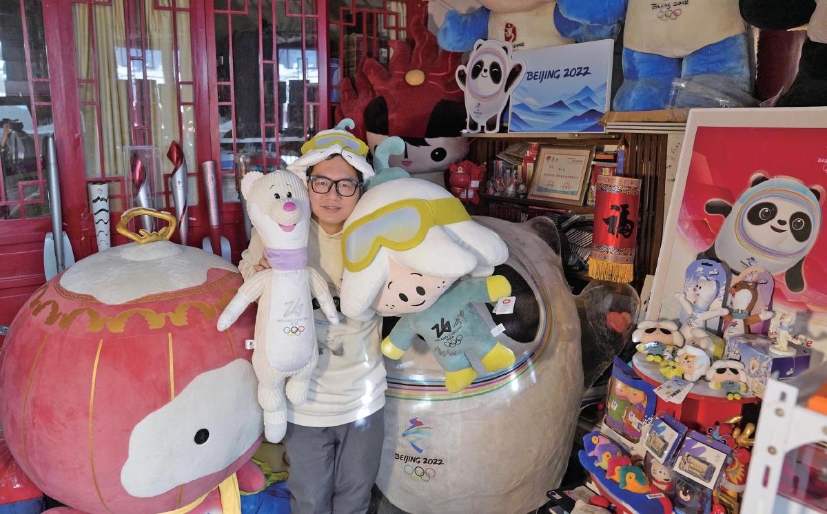张文全对奥运的痴迷始于2000年悉尼奥运会,此后26年热情不减。在西城一处胡同的尽头,30多平方米的空间里,“顶天立地”地堆满了张文全这些年购入的奥运纪念品,见证了一个普通人对国际赛事的向往:最醒目的是两个巨型冰墩墩、雪绒绒,圆胖的毛绒玩具需要两个成年人才能将其环抱;挨着窗框的是数支奥运火炬,造型不一,对面的置物架则摆满了各种各样的奥运吉祥物。张文全的奥运赛事收藏品已达到了7000多件,这间屋子中的藏品只是其中一部分。