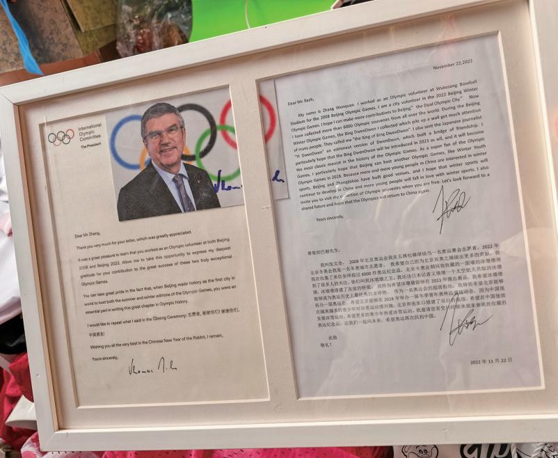 张文全不太擅长英文,答案是通过朋友的熟人翻译的,介绍了自己收藏纪念品、参与志愿活动和宣传的经历,还有与国际奥委会终身名誉主席巴赫的通信,在那封信里,巴赫用中文回复他“谢谢你们,中国朋友。”