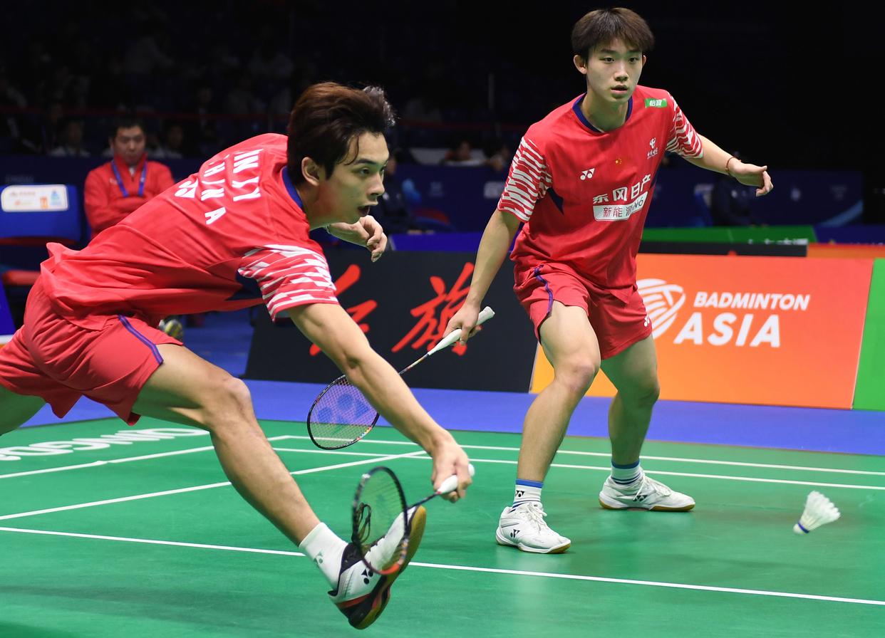 2月3日,中国队组合陈俊廷/刘峻荣(右)在男双比赛中回球。他们2比0战胜中国澳门队组合梁钰聪/黄觉永。新华社记者 李紫恒 摄
