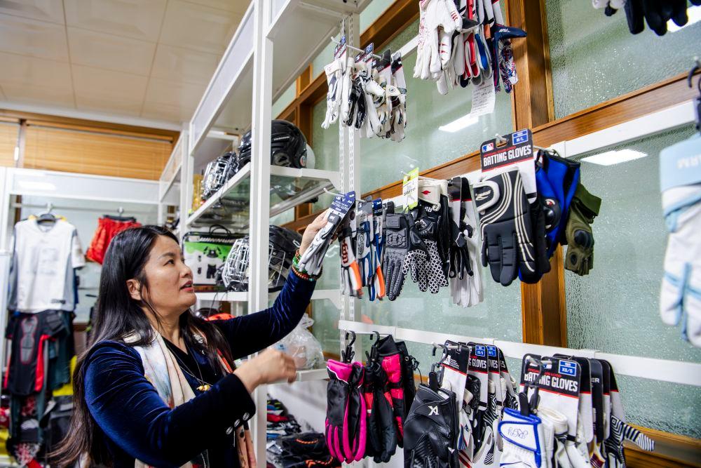 2026年1月6日,这是在厦门博特运动器材有限公司产品展示间,总经理叶小玲在介绍公司生产的冰球手套。新华社记者魏培全摄