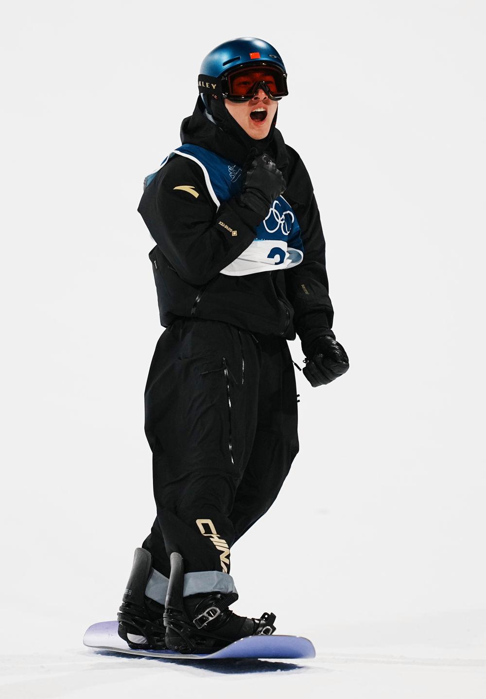 2026年2月5日,苏翊鸣在意大利利维尼奥举行的米兰-科尔蒂纳冬奥会单板滑雪项目男子大跳台预赛第三跳后庆祝。新华社记者胡超摄