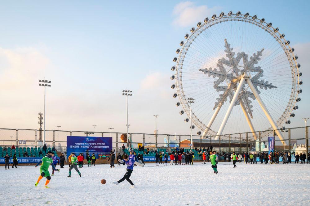 2025年12月20日,参赛球员们在哈尔滨市“冰超”系列冰雪赛事启动仪式暨“冰雪大世界杯”2025-2026年冰城首届“冰雪绿茵”大众雪地足球挑战赛中。新华社记者张涛摄