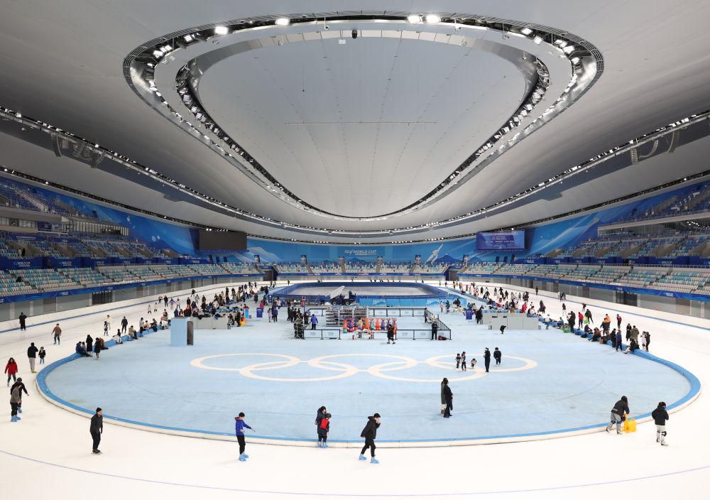 2025年1月4日,游客在国家速滑馆“冰丝带”体验滑冰。新华社记者张晨霖摄
