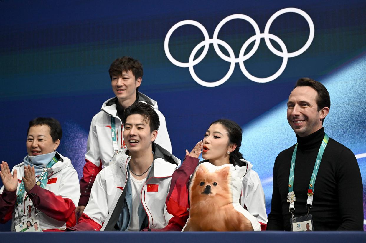 2月6日,中国组合王诗玥(右二)/柳鑫宇(右三)在赛后等待成绩。 新华社记者 程敏 摄