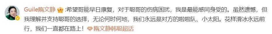 同时,韩聪也不忘祝福搭档:“希望小隋能够勇敢追逐自己的梦想,我们永远是花滑路上最坚实的伙伴!”隋文静则在回复中祝福韩聪早日康复,“对于聪哥的伤病困扰,我是最能感同身受的。虽然遗憾,但我理解并支持聪哥的选择,无论何时何地,我们永远是对方的拉拉队、小太阳。花样滑冰永远前行,我们一直都在路上!”