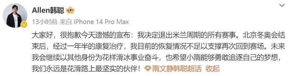 北京冬奥会夺金后,隋文静、韩聪一直处于休整状态。迫于伤病困扰,2023年8月,韩聪“官宣”告别赛场。他在社交媒体发文称,很抱歉遗憾地宣布:我决定退出米兰周期的所有赛事。他表示,自己在北京冬奥会后经过一年半的康复治疗,伤病恢复情况“不足以支撑再次回到赛场”。