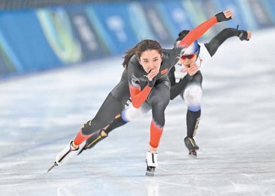 当地时间2月5日,中国速度滑冰队选手韩梅(前)在赛前训练。