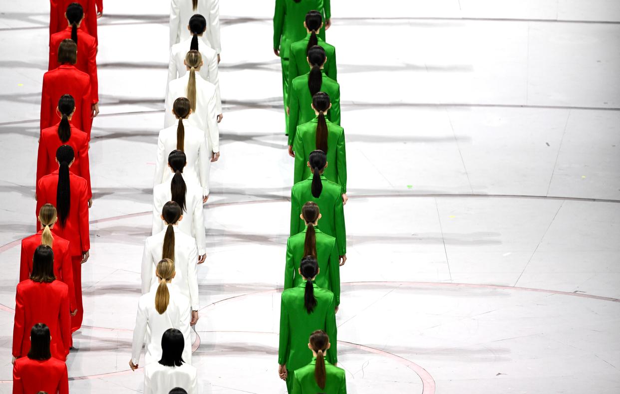 2月6日,模特身着代表意大利国旗颜色的服装入场。 当地时间2月6日,2026年米兰-科尔蒂纳冬奥会开幕式在意大利米兰圣西罗体育场举行。 新华社记者 李明 摄