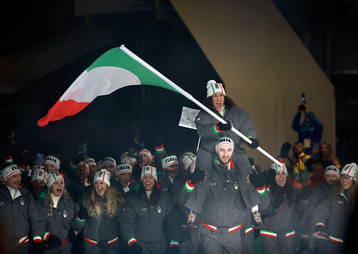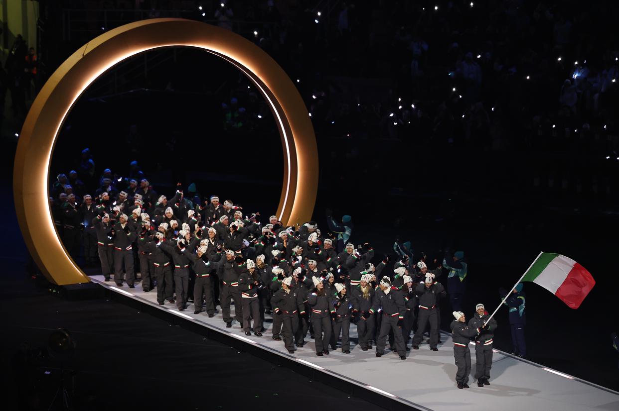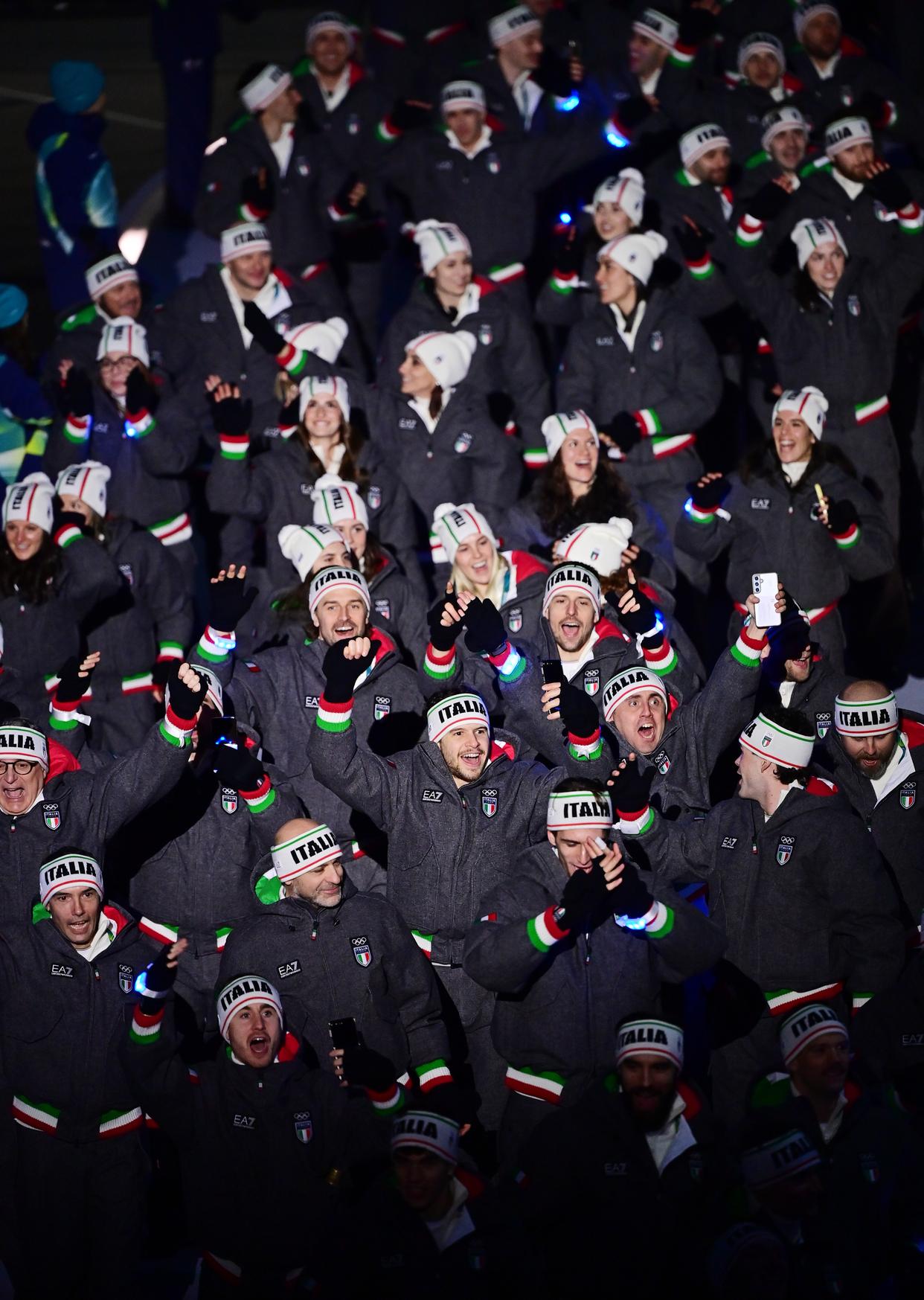 2月6日,意大利体育代表团在意大利科尔蒂纳参加入场仪式。 当地时间2月6日,2026年米兰-科尔蒂纳冬奥会开幕式在意大利米兰圣西罗体育场举行,冬奥会主火炬在米兰和平拱门和科尔蒂纳迪博纳广场同步点燃。 新华社记者 张晨霖 摄