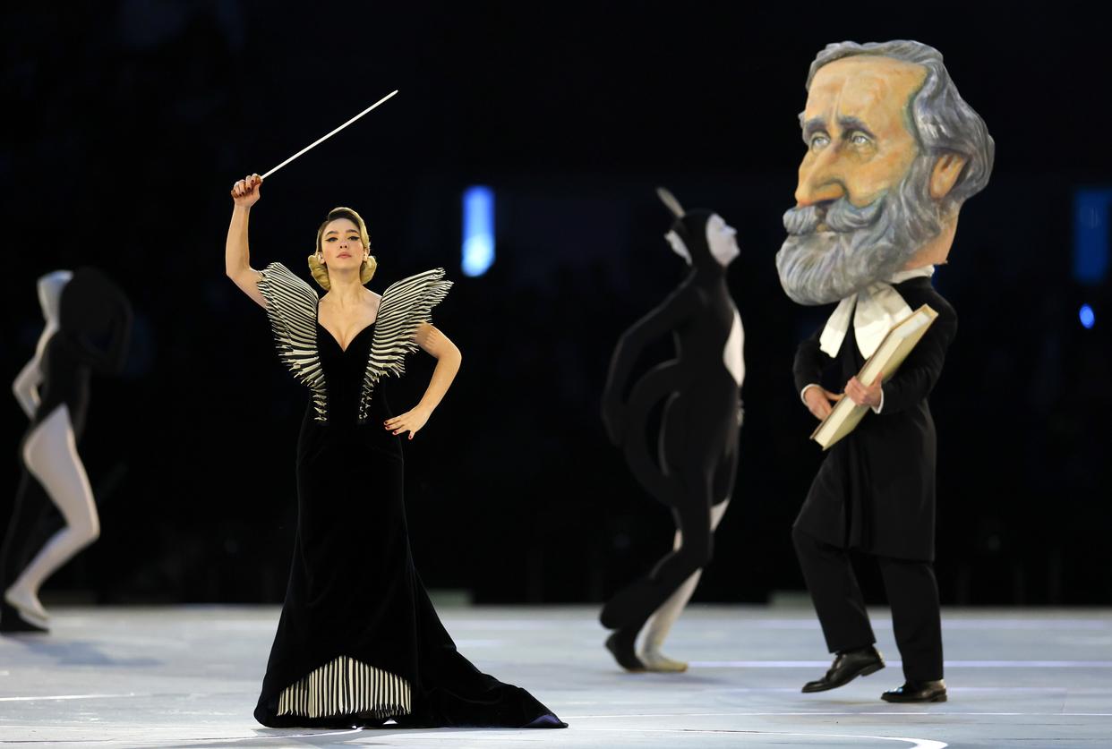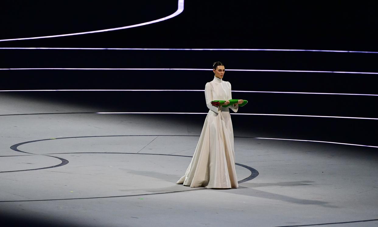 2月6日,模特维多利亚·切蕾蒂在开幕式上手捧意大利国旗入场。 当地时间2月6日,2026年米兰-科尔蒂纳冬奥会开幕式在意大利米兰圣西罗体育场举行。 新华社记者 陶希夷 摄