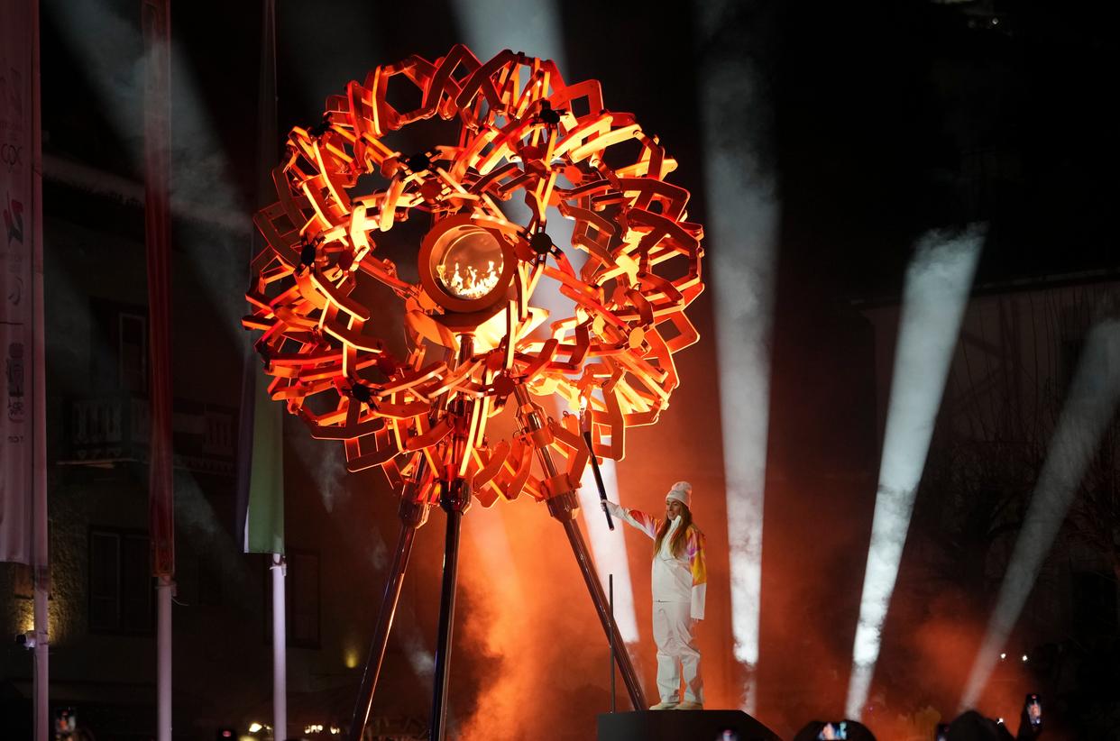 2月6日,在科尔蒂纳迪博纳广场,火炬手点燃主火炬。 当地时间2月6日,2026年米兰-科尔蒂纳冬奥会开幕式在意大利米兰圣西罗体育场举行,冬奥会主火炬在米兰和平拱门和科尔蒂纳迪博纳广场同步点燃。 新华社记者 丁旭 摄