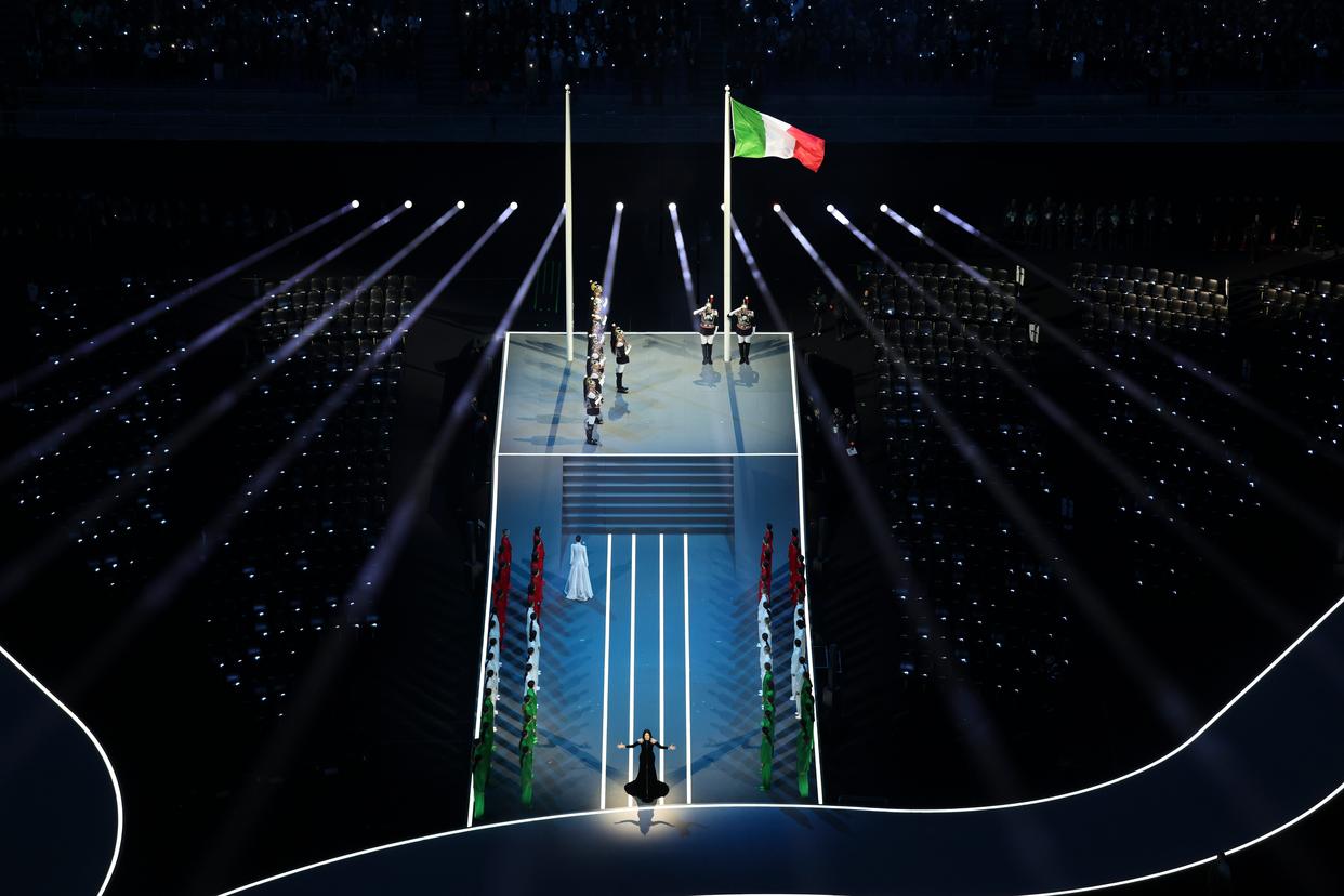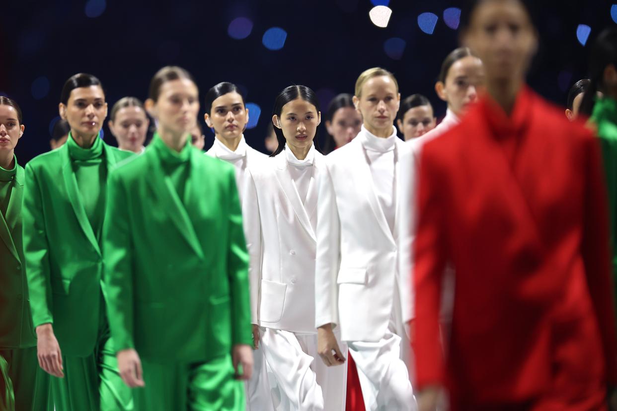 2月6日,模特身着代表意大利国旗颜色的服装入场。 当地时间2月6日,2026年米兰-科尔蒂纳冬奥会开幕式在意大利米兰圣西罗体育场举行。 新华社记者 张豪夫 摄