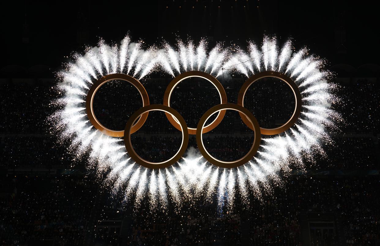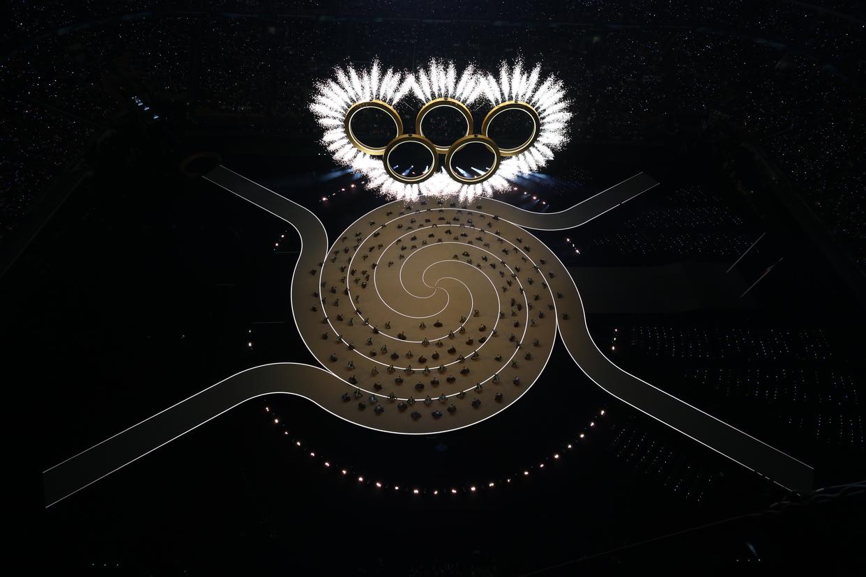 这是2月6日拍摄的开幕式现场的奥运五环。 当地时间2月6日,2026年米兰-科尔蒂纳冬奥会开幕式在意大利米兰圣西罗体育场举行。 新华社记者 陈益宸 摄