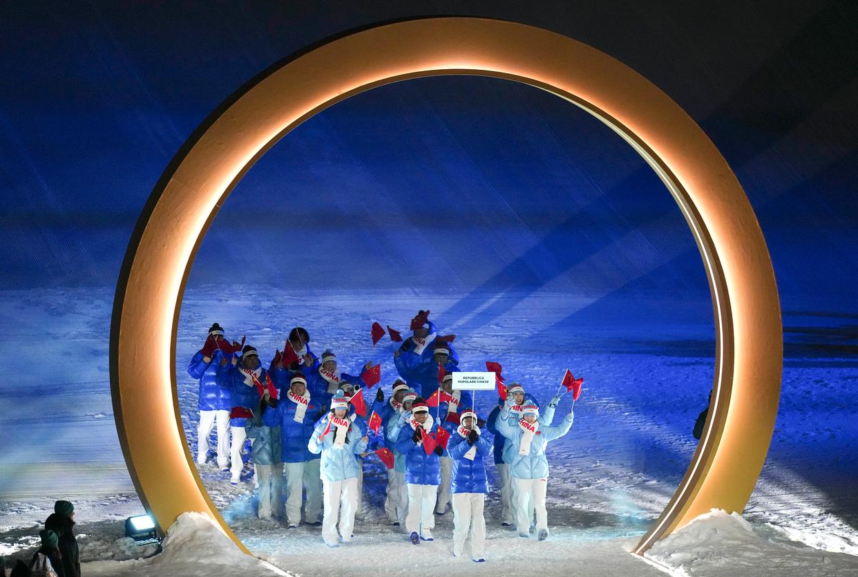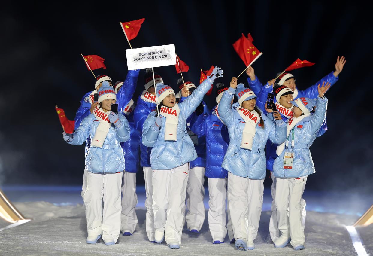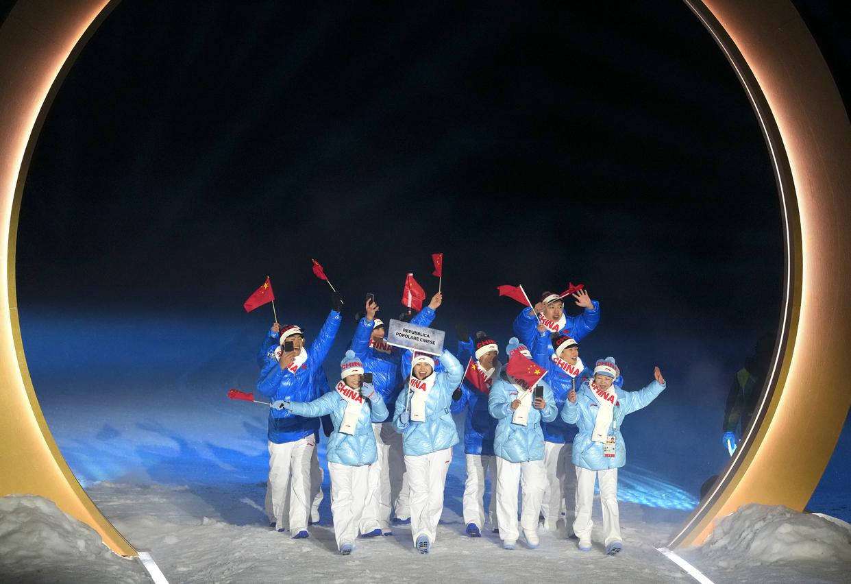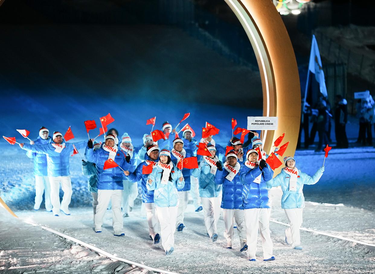 2月6日,中国体育代表团成员在意大利普雷达佐参加入场仪式。 当地时间2月6日,2026年米兰-科尔蒂纳冬奥会开幕式在意大利米兰圣西罗体育场举行。 新华社记者 孟永民 摄